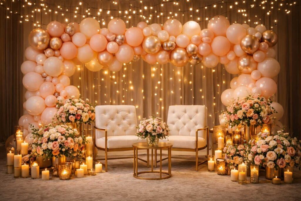 An organic balloon garland remains one of the most versatile and visually impressive engagement party decoration choices available. In 2026, couples are moving toward softer, more sophisticated colour combinations like ivory and sage, blush and champagne, and dusty rose and white rather than bright primary tones. A well-constructed balloon garland at varying sizes and heights reads as sculptural and styled rather than casual, especially when paired with dried floral clusters, greenery, or a personalised neon sign in front of it. This setup works equally well at home gatherings, rented halls, and outdoor garden parties, which makes it one of the most flexible decoration options on this list.